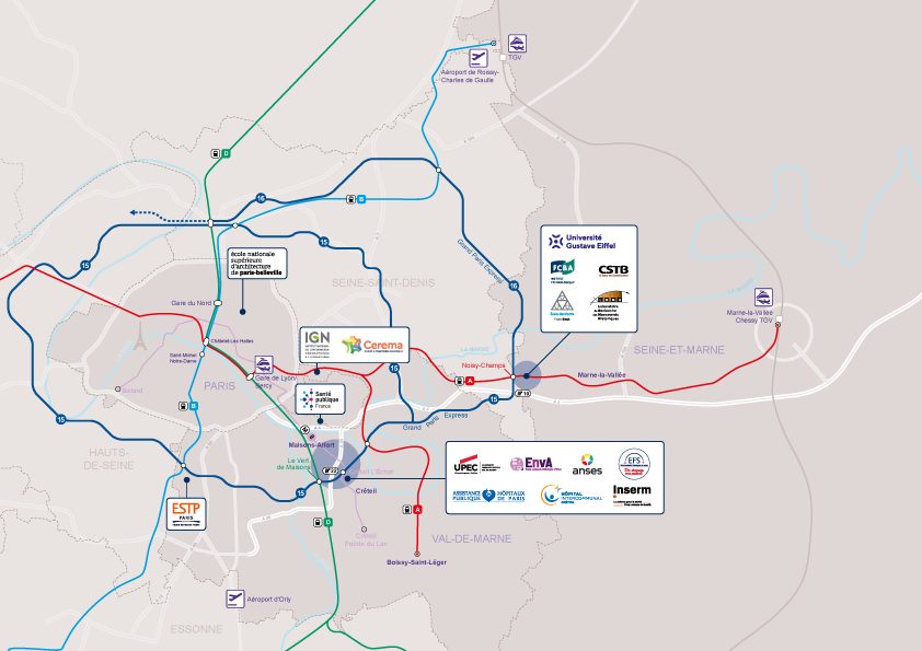 L'irrigation forte en transports en commun, notamment en RER et métro mais également en bus, permet un accès aisé entre les différents sites. Il sera encore amélioré dans le cadre des projets du Grand Paris avec le prolongement de la ligne 11 jusqu’à Noisy-Champs (Cité Descartes), la mise en service de la ligne 15 sud du Grand Paris Express à partir de 2024 et de la ligne 16 à horizon 2030. Des gains de temps substantiels sont attendus pour les usagers amenés à emprunter les transports en commun entre les sites de Créteil/ Maisons-Alfort et de la Cité Descartes : 45 minutes aujourd’hui contre 13 minutes en 2030 !